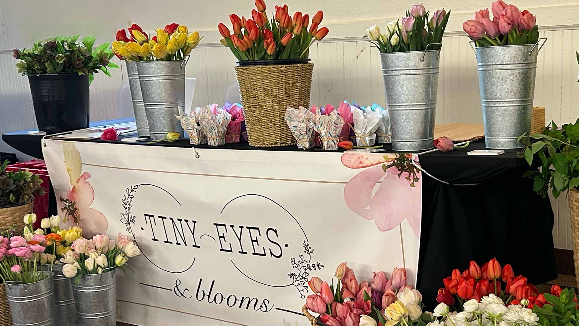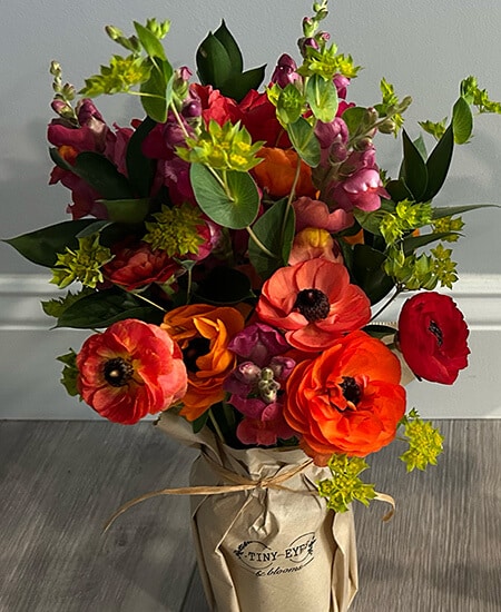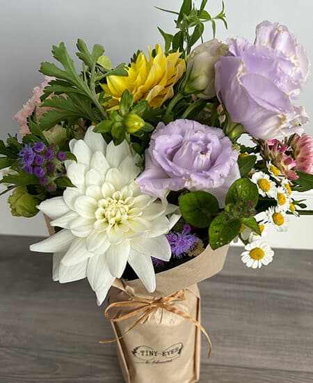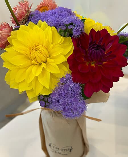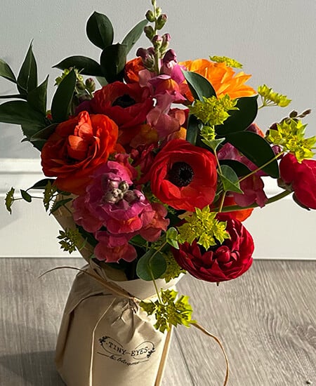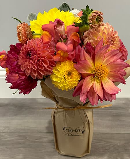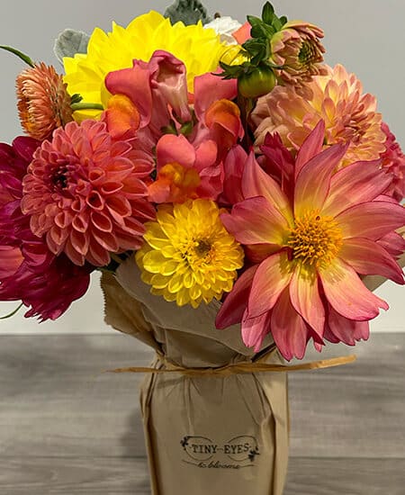 At Tiny Eyes and Blooms, every stem is grown with care right here in Swansea, MA. Whether you’re looking for a hand-tied bouquet bursting with color, a DIY bucket to spark your creativity, or fresh blooms for your floral shop, we’re here to share the beauty of our garden with you.