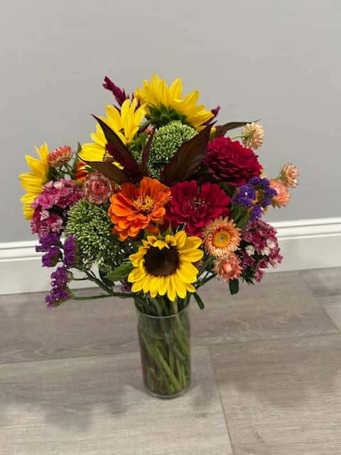 Flowers are provided as a hand-tied bouquet wrapped in kraft paper for porch pickup in Swansea, MA. Currently, delivery is available to business locations only and will include an additional surcharge. Delivered bouquets will be provided in a clear glass vase or kraft jar.